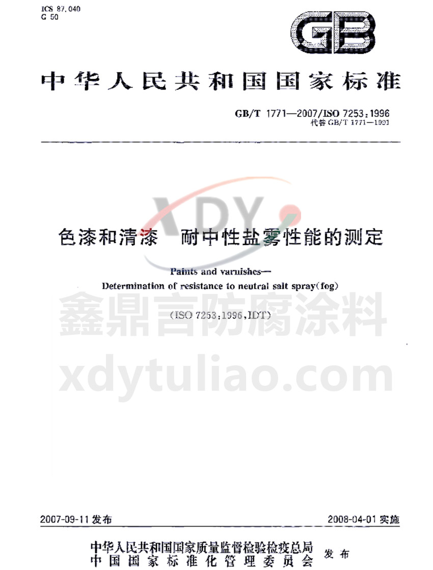 GB/T1771-2007色漆和清漆 耐中性鹽霧性能的測定標準是鑫鼎言防腐涂料照搬GB/T1771-2007《色漆和清漆 耐中性鹽霧性能的測定》紙質(zhì)版內(nèi)容。大家可以放心參考。 ICS 87.040 G50 GB 中華人民共和國國家標準 GB/T1771-2007/ISO 7253:1996代替GB/T1771-1991 色漆和清漆 耐中性鹽霧性能的測定Paints and var