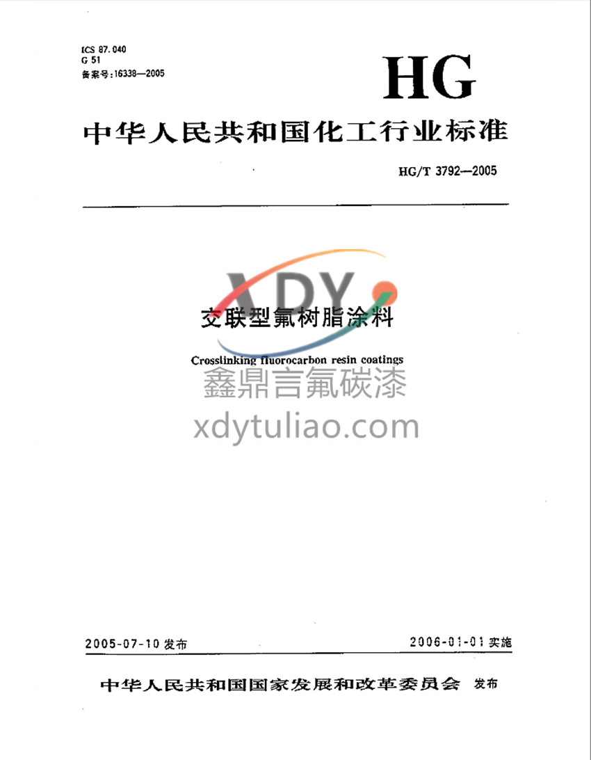 交聯(lián)型氟樹脂涂料化工行業(yè)標(biāo)準(zhǔn)HG/T 3792-2005:中華人民共和國化工行業(yè)標(biāo)準(zhǔn) 2005-07-10發(fā)布 2006-01-01實(shí)施 中華人民共和國國家發(fā)展和改革委員會發(fā)布 本標(biāo)準(zhǔn)適用于以含反應(yīng)性官能團(tuán)的氟樹脂為主要成膜物并加入顏填料(清漆不加)、溶劑、助劑等輔料作為主劑、以脂肪族多異氰酸酯樹脂為固化劑的雙組份常溫固化型建筑外墻用面漆和金屬表面用面漆。本標(biāo)準(zhǔn)還適用于以含反應(yīng)性官能團(tuán)的氟樹