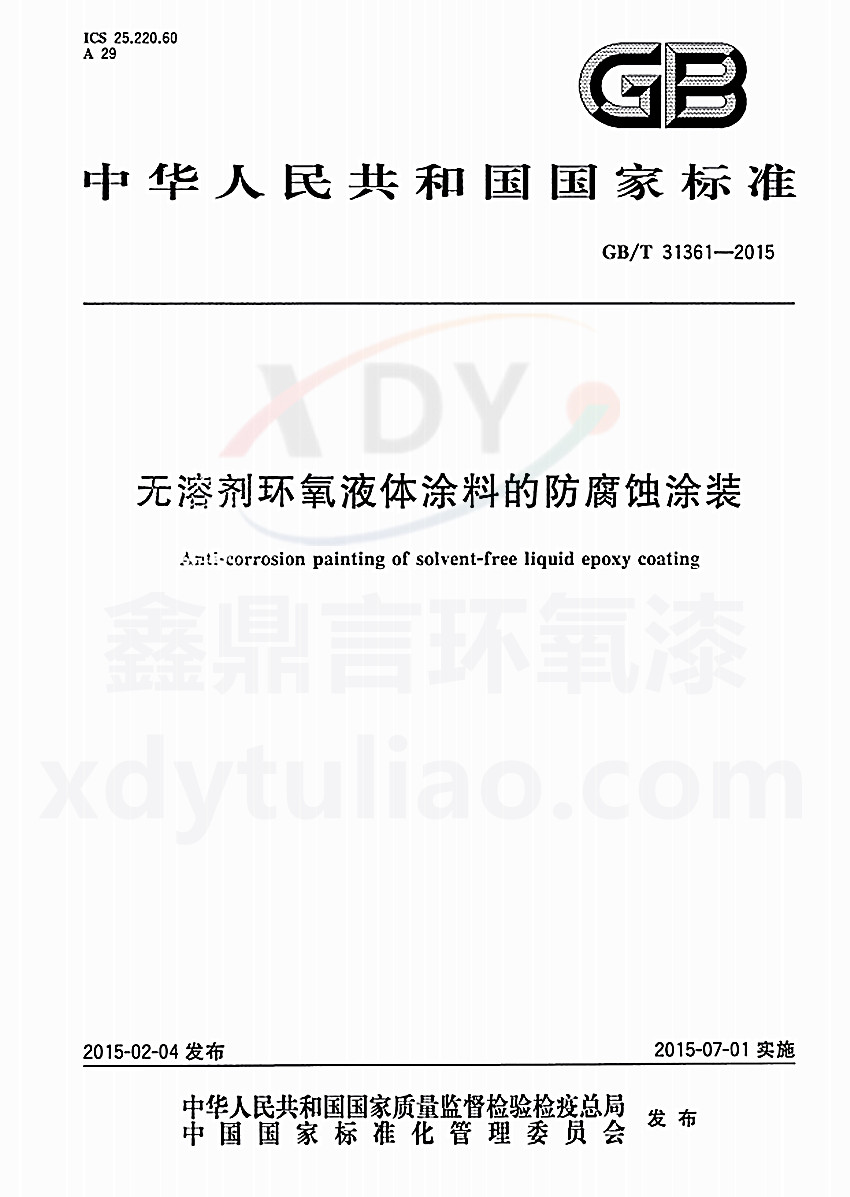 GB/T 31361-2015無溶劑環(huán)氧液體涂料的防腐蝕涂裝標(biāo)準(zhǔn) ICS25.220.60 A29 GB 中華人民共和國國家標(biāo)準(zhǔn) GB/T 31361-2015 無溶劑環(huán)氧液體涂料的防腐蝕涂裝anti-corrosion painting of solvent-free liquid epoxy coating 2015-02-04發(fā)布 2015-07-01實施 中華人民共和國國家質(zhì)量監(jiān)督檢驗檢